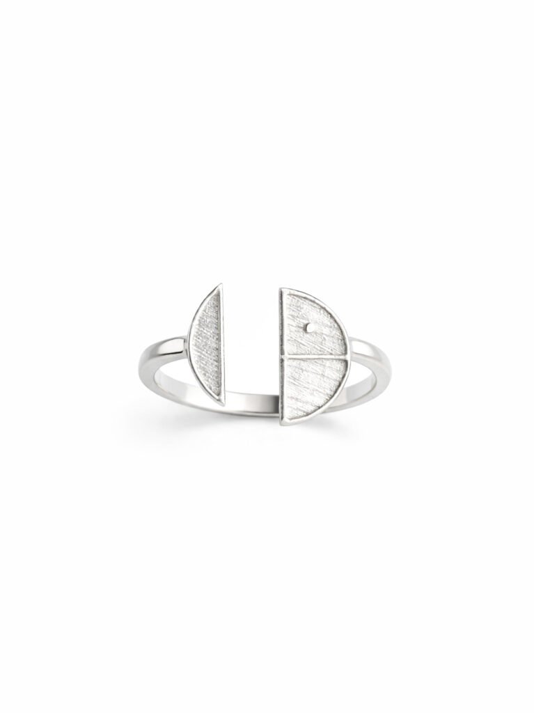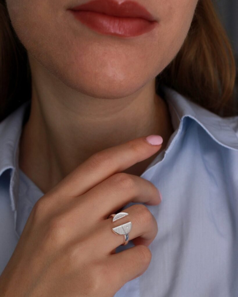 L’anello Nûlêye (nuvola in vallone) trae ispirazione dall’estetica surrealista ed evoca l’immagine di una nuvola sospesa con spiraglio di luce. La pietra incastonata è un punto-colore: una nota cromatica che richiama il contrasto tra cielo e natura, tra leggerezza e materia. Il topazio evoca l’azzurro profondo mentre il peridoto richiama i toni della terra e della vita.