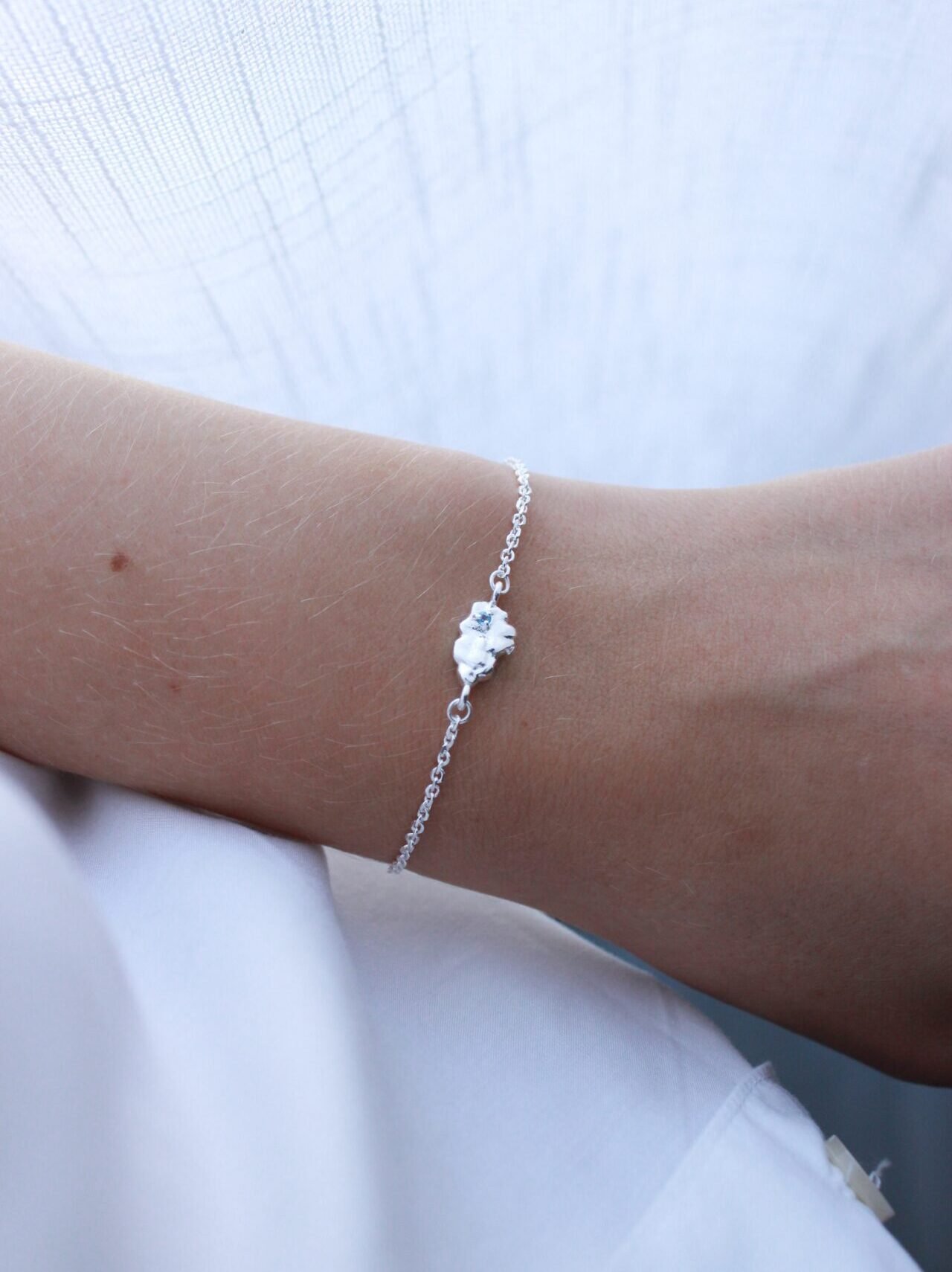 Il bracciale Nûlêye (nuvola in vallone) trae ispirazione dall’estetica surrealista ed evoca l’immagine di una nuvola sospesa con spiraglio di luce. La pietra incastonata è un punto-colore: una nota cromatica che richiama il contrasto tra cielo e natura, tra leggerezza e materia. Il topazio evoca l’azzurro profondo mentre il peridoto richiama i toni vibranti della terra e della vita.