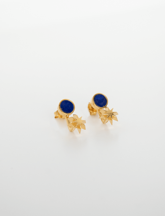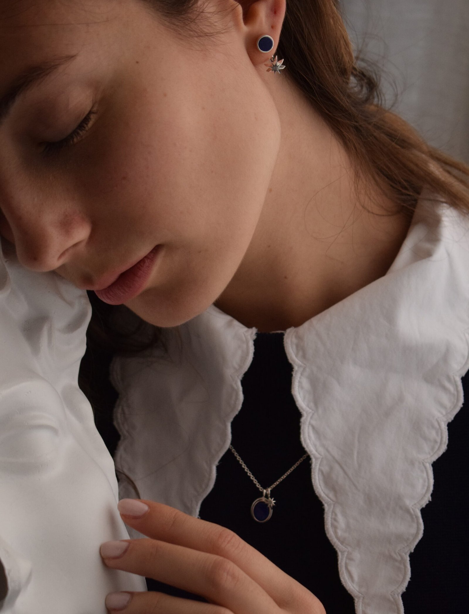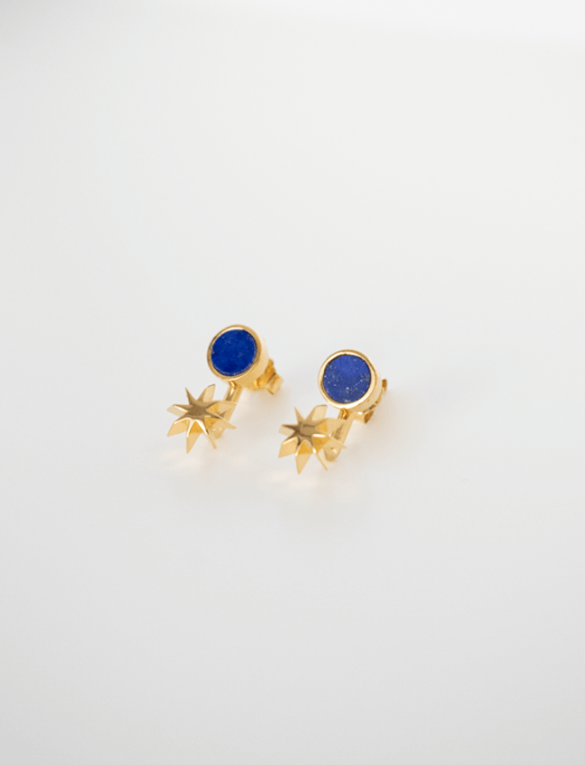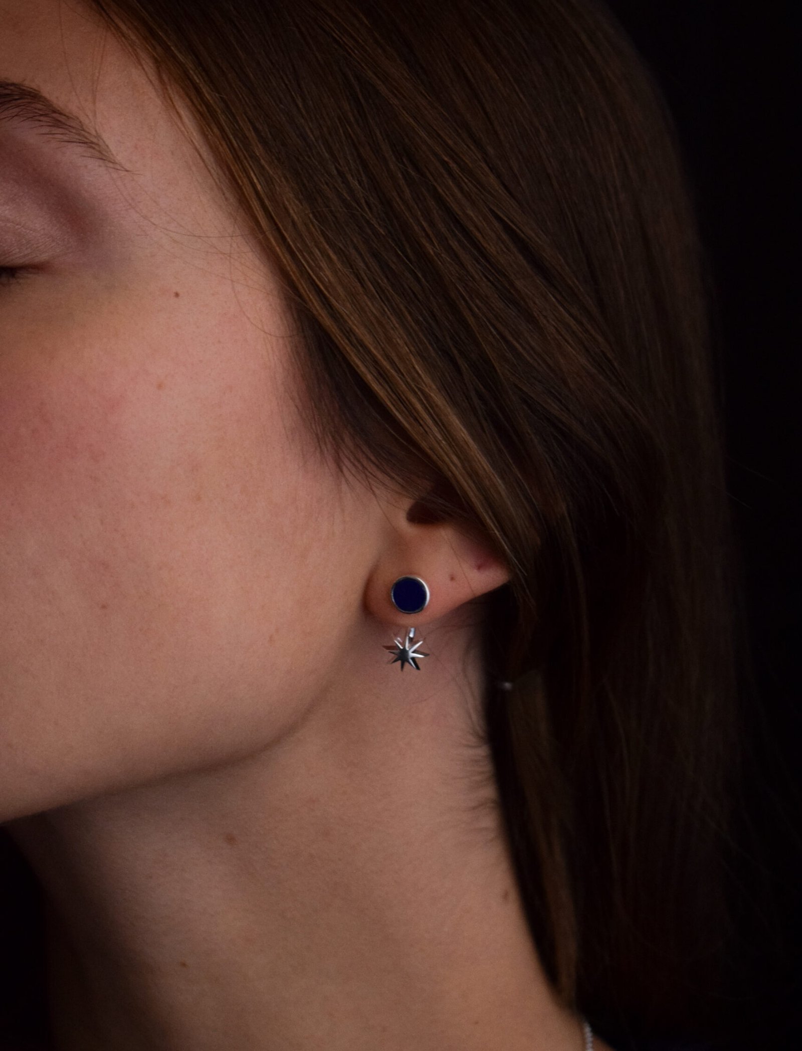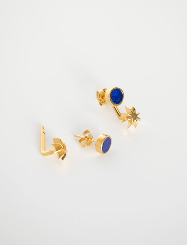 Gli orecchini “E quindi uscimmo a riveder le stelle” sono liberamente ispirati alla Cappella degli Scrovegni di Giotto. La notte stellata è racchiusa nel blu intenso del lapislazzuli e due stelle a 8 punte, simbolo di infinito, restano sospese sotto ai lobi dell’orecchio.